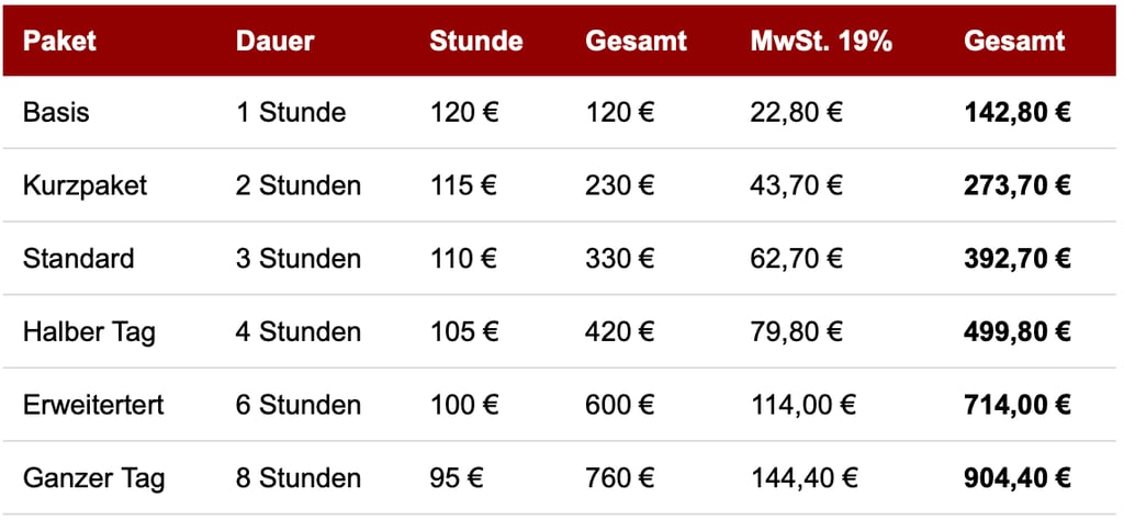 Bis 3 Stunden: 90 – 120 € Abendveranstaltung 18-00 Uhr: 200-320 €