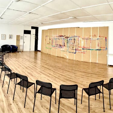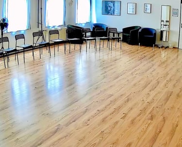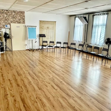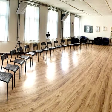 Unser 70 m² großes Studio ist ein heller Raum mit sechs großen Fenstern und Laminatboden – ideal für Workshops, Seminare und kreative Formate. Die Atmosphäre lädt ein zum Lernen und Arbeiten.